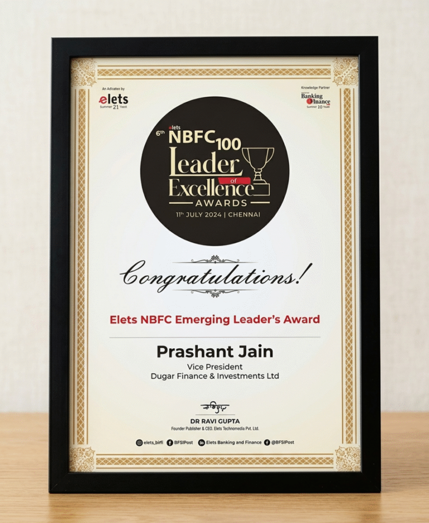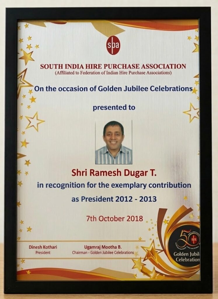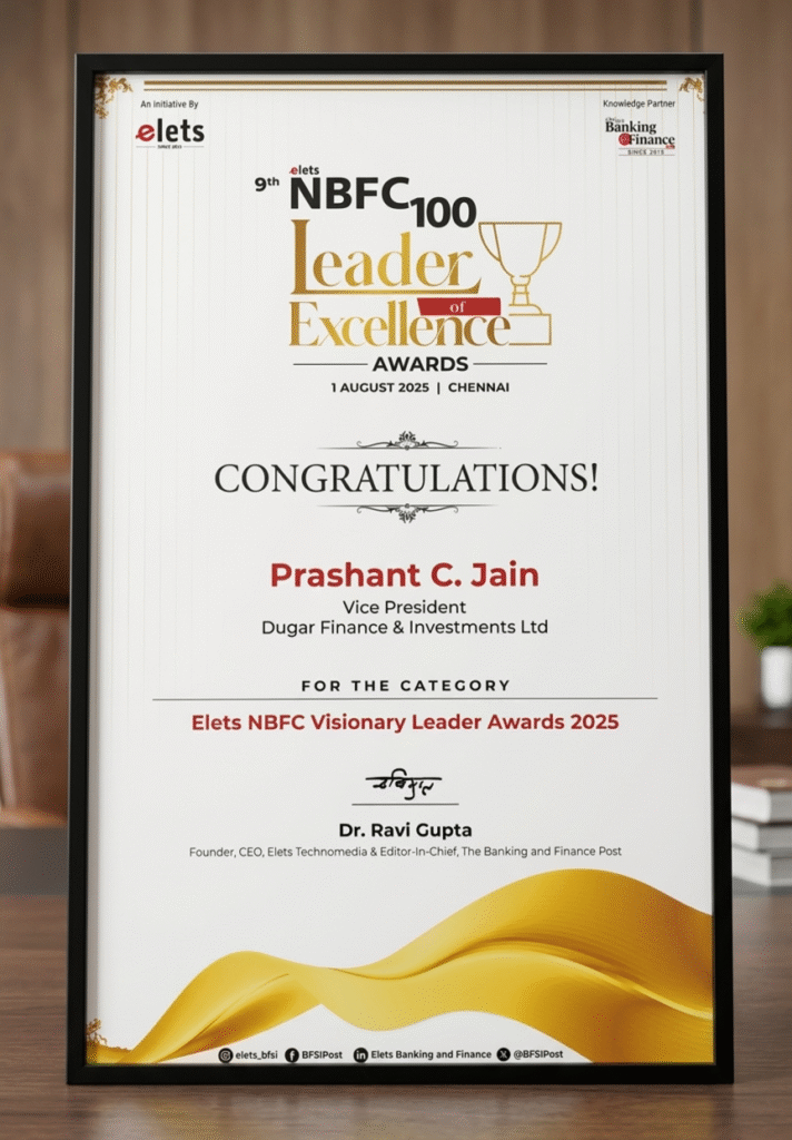 Awards & Accolades Awards & Accolades Dugar Finance has been recognized across India for its commitment to innovation, inclusion, and sustainable financial empowerment. Entrepreneur of the Year 2024 – Mid-Size NBFC Category Emerging NBFC of the Year 2024 South India Hire Purchase Association awards our MD Ramesh Dugar Emerging NBFC of the Year 2025